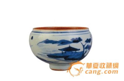 图二所示是一件清顺治青花瓷器,为一青花山水纹钵,高7.5厘米,口径9.8厘米,足径3.8厘米。此钵口微敛,圆腹下收,假圈