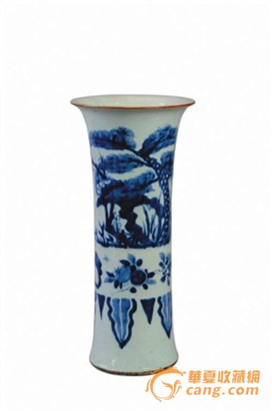 图一所示是一件清顺治青花松竹梅纹筒花觚,高45.9厘米,口径20.8厘米,底径15.3厘米。这件花觚器身修长,侈口,腰部渐收,平底无釉,且底部可见旋痕,口沿略施一圈酱黄色釉。这些特征与耿宝昌《明清瓷器鉴定》书中介绍的顺治青花筒花觚的特点完全一致,是清顺治时期最为经典的器型之一。这类花觚之所以定名为“筒花觚”,是因器型有别于另一类鼓腹花觚。