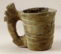 鉴赏要点 细泥质黑灰陶。敞口、圆唇、壁斜直,平底。器侧有一扁体拱形鋬,鋬顶凸出四个扉牙,形似兽头鉴。壁表饰两周宽弦纹。通体磨光,形制别致,系实用与美观相结合的罕见精致陶杯。