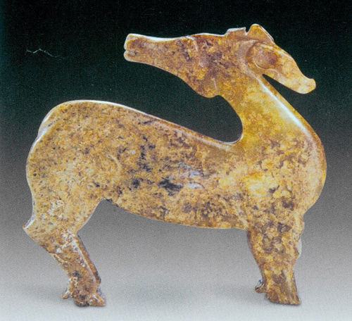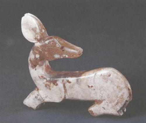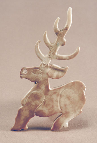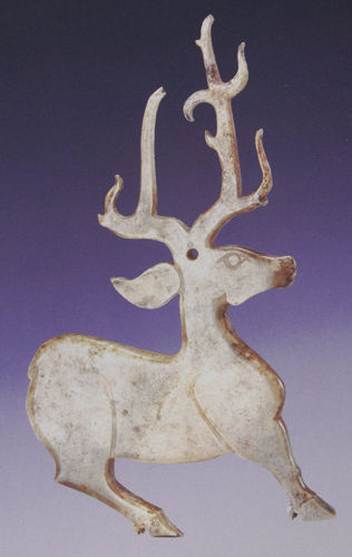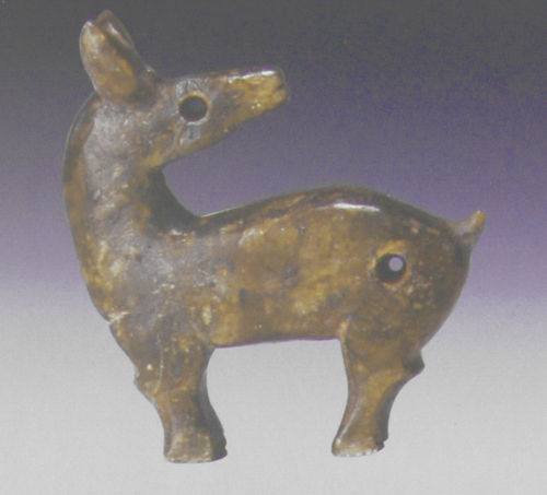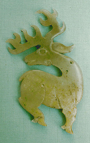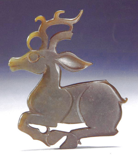 图1 安阳殷墟出土商代晚期玉鹿 图2 山东滕县前掌大商代墓葬出土玉鹿 图3 三门峡虢国博物馆藏西周早期玉鹿 图4 北京故宫博物院藏西周早期玉鹿 图5 陕西宝鸡市博物馆藏西周中期玉鹿 图6 山西博物院藏西周中期玉鹿 山西博物院藏玉鹿(图6),通高4.7厘米,宽4.5厘米,厚0.4厘米。大河口墓地1号墓出土。和田玉,青色,有沁斑。鹿呈站立状,鹿身肥健,后肢微屈,阴线雕出圆目和眼角线,整体造型简练而极富表现力。 图7 三门峡虢国博物馆藏西周中期玉鹿 三门峡虢国博物馆藏玉鹿(图7),通高4.3厘米,身长4.9厘米,厚0.1~0.5厘米。青玉,浅冰青色,因局部受沁,有灰褐色、灰白色斑块和斑点。鹿呈回首伏卧状。双面以阴刻线勾勒出鹿的口、眼、胸、腹等部位,圆眼,头上小角。无穿孔。 图8 陕西宝鸡青铜器博物馆藏西周中期玉鹿 陕西宝鸡青铜器博物馆藏玉鹿(图8),通高8.8厘米,长7.2厘米,厚0.4厘米。青玉,青褐色。鹿呈站立状,鹿身硕健,后肢微屈,头顶两角分枝耸起,形成一圆孔。阴线雕出圆目和眼角线,目平视前方,鼻、口微张,作嘶鸣状。耳大伸直,并碾琢出耳窝。鹿背、腹、臀部均切边去棱,琢磨成弧形,有圆雕之效果。 图9 陕西宝鸡青铜器博物馆藏西周中期玉鹿 陕西宝鸡青铜器博物馆藏玉鹿(图9),通高4厘米,长3.9厘米,宽1.1厘米。青玉,深灰色。圆雕,雌性幼鹿形象。呈站立回首状,无角,头顶两大耳耸起。鹿身健美,充满了稚气和活力。两目透穿为圆孔。小尾翘起,臀部有一较大圆孔,前后蹄足亦各钻一穿孔。 图10 山西省考古研究所藏西周中期玉鹿 山西省考古研究所藏玉鹿(图10),高5. 5厘米,宽4.6厘米。黄褐色,扁平体。鹿作站立状,首略昂,眼观前方。闭口,大耳后张,角分长短两枝。身躯丰腴,凸胸,拱背,短尾。前肢挺直,后肢稍屈,似正欲发力起跑。短角上一分枝卷曲成孔,可穿系佩挂。 图11 河南博物院藏西周晚期玉鹿 图12 三门峡虢国博物馆藏西周晚期玉鹿 三门峡虢国博物馆藏玉鹿(图12),高5.1厘米,厚0.5厘米。青玉,冰青色,局部受沁呈棕黄色,微透明。角部略残,回首而立。腿、头部有阴线轮廓线,头部有一圆穿。形象逼真,神态自然。 图13 三门峡虢国博物馆藏西周晚期玉鹿 三门峡虢国博物馆藏玉鹿(图13),通高6厘米,身长5.6厘米,厚0.1~0.4厘米。青玉,深冰青色,局部受沁有灰白色斑点。鹿呈奔跑状,前腿跃起,后蹄着地。双面以阴刻线勾勒出鹿的口、眼、耳、胸、腹、尾、蹄等部位,线条流畅。臣字眼,叶形耳,大角,短尾。无穿孔。 在古人心目中,鹿是一种瑞兽,有祥瑞之兆。《宋书·符瑞志》载:“白鹿,王者明惠及下则至。”认为鹿为纯善禄兽,“鹿”与“禄”谐音,寓意加官进禄、权力显赫。因此,古代玉器中鹿纹图案较多,造型亦千姿百态,丰富多彩,或卧或立,或奔跑于山间绿野,或漫步于林间树下,皆生动秀美、雅致可爱。 玉器中的鹿纹最早出现在商代,以后各代屡有发展变化,各具时代特征。其造型丰富多彩,寓意吉祥,是深受国人喜爱的装饰纹样,体现了人们对美好生活的追求和向往。 商代玉鹿的特点 商代玉鹿造型简单,以片状居多,圆雕较少。最大的长8厘米左右,一般在3~4厘米,常呈短腿直立回首状。琢玉工匠刻意突出鹿角、耳以及眼睛,其他部位则一带而过,仅具其形。鹿角有几种,一种没有角,一种为枝杈形角,另有一种是双角对分,或对称或不对称。眼睛可分为小圆眼、臣字眼、菱形眼、橄榄形眼等,而且大都是由阴线刻划而成。躯体上多无纹饰,有的只有几条阴刻线作为分界线,把躯体和四肢分开。穿孔多在颈部、臀部,可供佩戴。安阳殷墟出土的商代晚期玉鹿(图1),长3.5厘米,宽2.7厘米,厚0.57厘米。青白色,鹿作回首状,口微张,双耳后展;四腿前屈作卧状,前足有斜向孔,无尾。1991年山东滕县前掌大商代墓葬出土的玉鹿(图2),高5.4厘米,宽4.3厘米,厚0.5厘米。两面平雕,纹饰相同。两角枝杈突出,作回首状,翘首圆眼,上下颌、鼻、嘴分明;颈间有涡纹,圆臀小尾,后腿略弯。颈间有一穿孔。兼具写实、夸张之美。 周代玉鹿的变化 周代玉鹿也多为片状,光素无纹,仅有几条简洁的轮廓线,一般比商代的略大。有回首、前视、伏卧、站立等各种造型,气宇昂然,姿态优美,刀法爽健,磨制细腻。鹿大耳、大眼,角的枝杈像小树一样直立头顶,有对称和不对称两种,其中不对称的长角相对较多。足粗蹄大,大多是半蹄状,整个躯体显得较肥壮。但其身体与长角相比,常有头重脚轻的感觉。穿孔也多在颈部、臀部。现择其各地出土的玉鹿加以介绍说明。 西周早期玉鹿 三门峡虢国博物馆藏玉鹿(图3),通高4.7厘米,宽4厘米,厚0.1~0.4厘米。青玉,浅冰青色,因局部受沁有灰褐色和灰白色斑块和斑点。鹿呈站立状,头上仰,鹿角似耙状。无穿。 北京故宫博物院藏玉鹿(图4),长4厘米,宽3.4厘米,厚0.7厘米。绿色,局部沁色较重。鹿首无角,卧地回首。造型有动感,饰纹较繁复。 西周中期玉鹿 陕西宝鸡市博物馆藏玉鹿(图5),通高9厘米,厚0.4厘米。和田玉,受血沁后现呈灰绿色,间有灰褐斑。鹿体扁平,角枝高耸,臣字眼,体态肥圆,小尾下垂,四肢壮实有力。姿态如在奔跑中倏然止步,昂首前视,大耳抿后,将鹿奔跑的迅疾和受吓后的惊恐表现得淋漓尽致。鹿角根部钻一圆孔,用以悬佩。雕琢纹饰简洁,形态生动逼真,寥寥数笔就突现了鹿的机警性格。 山西博物院藏玉鹿(图6),通高4.7厘米,宽4.5厘米,厚0.4厘米。大河口墓地1号墓出土。和田玉,