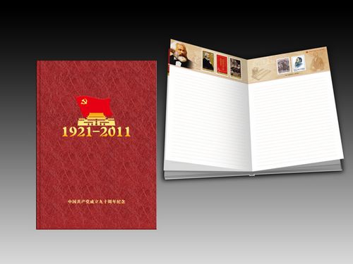 笔记本封面采用凡尔赛金特种纸,红色艳而不俗。画面简洁,主题突出。剪影式的图案用烫金(红)工艺来表现,阿拉伯数字“1921-2011”厚重且具有历史感,鲜红的党旗在金色的天安门上空飘扬。