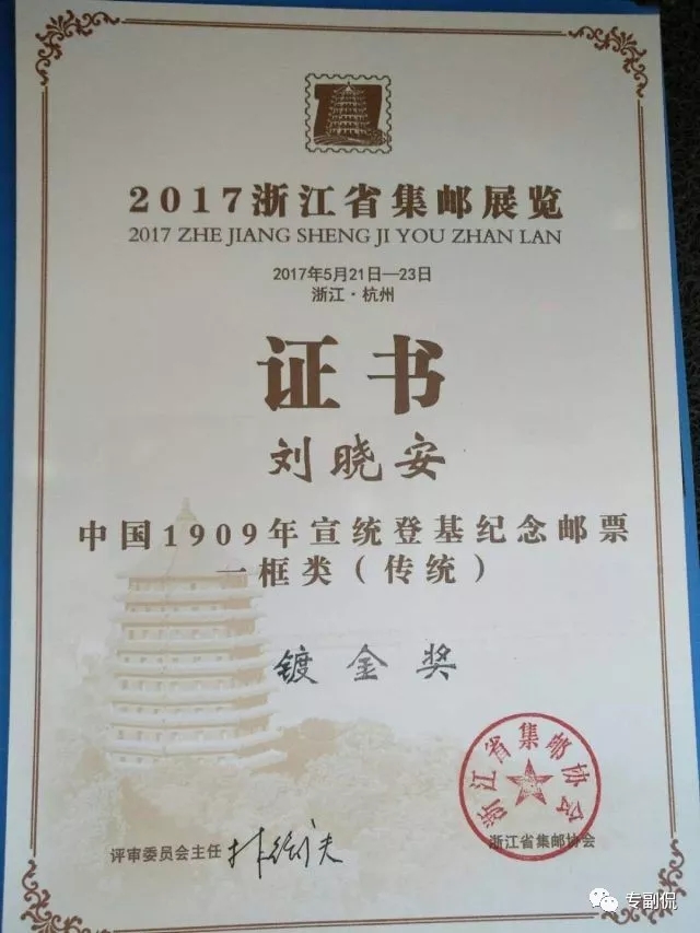 刘晓安在协会里汲取了很多专业的集邮知识。2017年5月,在浙江大学120周年集邮活动中,他的《中国1909年宣统登基纪念邮票》获得镀金奖,仅次于金奖。