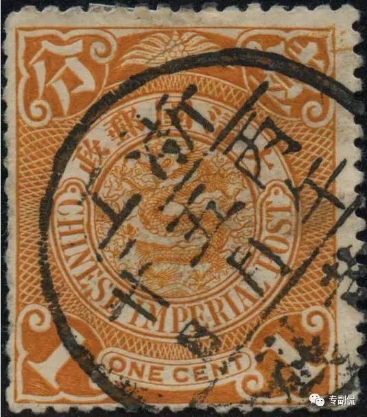 清代蟠龙图邮票。邮票上盖有“浙江黄岩丙午年五月廿日”的黑色邮戳印,是早期黄岩邮戳。