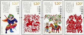 新中国最早的剪纸题材邮票,当推1959年发行的特30《剪纸》邮票。在小小票幅之内,展现出骆驼、石榴、公鸡、戏剧人物的剪纸作品;1973年6月1日,原邮电部又推出编号86—90《儿童歌舞》剪纸邮票5枚,邮票图案线条流畅,造型优美,画面表现了汉、蒙、藏、维吾尔、朝鲜族少年儿童歌舞的场景;2000年2月5日发行的《春节》特种邮票小型张,在边纸上绘有各种剪纸图案,以此表达了吉祥如意、年年有余、富贵平安“喜迎春”的主题;2010年8月16日发行的《民间传说——牛郎织女》特种邮票,是一套采用民间剪纸艺术表现民间故事的邮票;2012年7月1日发行的《城乡居民社会养老保险制度全覆盖》纪念邮票一套1枚,图案为一盏宫灯造型的剪纸。宫灯中一对开怀而笑的老年夫妇以及作为背景的新房和农村风貌,反映了城乡居民社会养老保险制度全覆盖后,老年人生活无忧的社会图景。