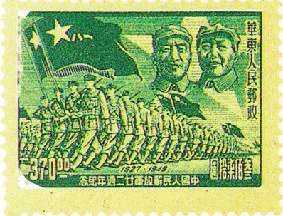 我国最早出现“八一军旗”的邮票,是1949年8月1日, 刚解放的上海华东人民邮政发行的《中国人民解放军建军22周年》(俗称《华东进军图》)邮票(图一),一套5枚,同图异色异值,邮票右上方为毛泽东主席和朱德总司令头像,下方是铁流般的人民军队高举着一面面“八一军旗”。