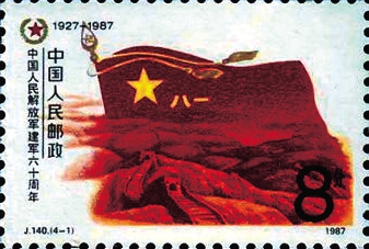 1987年8月1日原邮电部发行的《中国人民解放军建军60周年》纪念邮票一套4枚。其中第1枚“军魂”(图三),邮票上一面鲜红的“八一”军旗迎风飘扬,旗下是蜿蜒的万里长城,代表了中国人民解放军是保卫祖国和人民的“钢铁长城”。