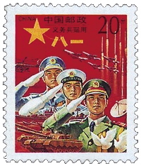 1995年8月1日,原邮电部试发行一套“义务兵专用”邮票一套1枚(图四),票名为“神圣的使命”,图案以红光四射的“八一”军旗为背景,以现代化的飞机、坦克、火箭和象征和平的白鸽为衬托,画面是威武的陆海空三军,显示我军钢铁长城般功无不克、战无不胜的精神风貌。