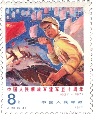 1977年8月1日原邮电部发行的《中国人民解放军建军50周年》纪念邮票,其中第4枚“雄师过大江”(图二),图案中一名冲在渡江队伍前面的战士高举一面“八一”军旗。