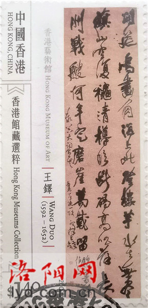 自唐以后,洛阳最有名气的书法家,是出生于孟津的明末清初书法大家王铎。2009年5月16日,中国香港邮政发行《香港馆藏选粹》邮票一套6枚,其中第一枚邮票是王铎的行书作品《饮义楼作诗》(局部)。王铎的这件书法作品高286.5厘米、宽70.8厘米,现藏于香港艺术馆虚白斋。