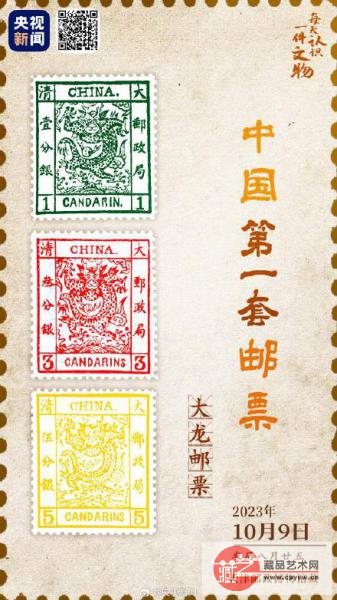 大龙邮票,发行于1878年7月,是中国第一套邮票。邮票图案正中,绘一条两目圆睁的五爪蟠龙,在云彩水浪的衬托下腾云驾雾。大龙邮票采用凸版印刷,铜制版模是手工逐枚雕刻制成,先后分三期印制发行,即薄纸大龙、阔边大龙、厚纸大龙。