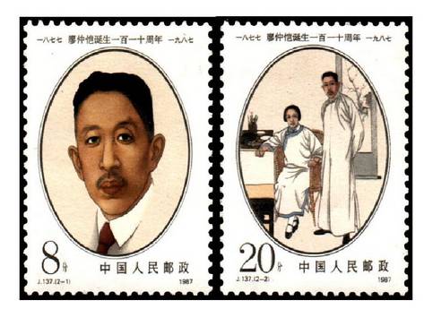 第一位与丈夫一起走上“方寸”的女性是何香凝。1987年 4月 23日,廖仲恺先生诞生 110周年,我国为此特发行纪念邮票 J。 137《廖仲恺诞生一百一十周年》一套2枚。有趣的是在第二枚票面中,展现了曾任全国妇联名誉主席的何香凝的坐像,而廖公则站立在她的身旁。