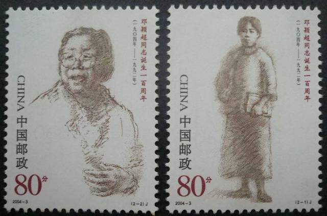 为纪念邓颖超诞辰100周年,中国邮政在2004年2月4日发行了《邓颖超同志诞生一百周年》纪念邮票, 全套邮票 2 枚, 胶雕套印, 12 度齿孔, 邮票规格:30mm * 40mm 。