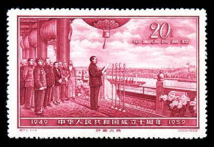 1959年为庆祝中华人民共和国成立十周年发行的第五组开国大典纪念邮票(纪71)票面上,宋庆龄和朱德、刘少奇、周恩来等站在天安门城楼上与毛泽东主席一起宣告新中国的成立。