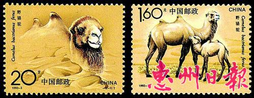 野骆驼是巨大的有蹄类动物,历史上曾活动于世界上很多地方,但至21世纪仍在野外生存的仅有蒙古西部的阿塔山和中国西北一带。为促进野骆驼和其他动物保护,中国邮政于1993年2月20日发行《野骆驼》特种邮票一套两枚,是当时少见的胶印发行邮票。第一枚邮票为野骆驼头部特写,面值为20分;第二枚邮票为大小骆驼站立图,面值为160分,由当时的河南邮电印刷厂印制。 著名动物小说大王沈石溪的力作《骆驼王子》,描述的是历经磨难的老一辈野骆驼溺爱“骆驼王子”,即使是在它已长大的情况下,仍然把它当做孩子,使它的心理和生理都没能得到正常、健康发展,生活技能低下,缺少爱好和生活的勇气。最后,骆驼王子宁愿放弃自由的生活,而为人类背行李,以锻炼自己。这部作品非常适合小朋友阅读。 (文/图 方晓冰)
