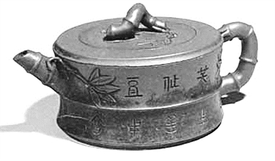 1977年,在上海金山县的一座清代墓葬中出土了一把刻有陈曼生铭款的紫砂竹节壶。此壶通高8.8厘米,腹高6.5厘米,腹径12.2厘米,嘴长3厘米,鋬宽3.7厘米。通体紫里透红,以竹段、竹节、竹叶作装饰,壶身稳重挺拔,壶嘴刚直遒劲,壶盖合口严密。壶腹阴刻“单昊生作羊豆用享”篆体八字,署“曼生”楷书款,壶盖内钤阳文篆书“万泉”二字。据墓志铭得知墓主为湖北宜昌府候补道王玷山,王玷山是陈曼生的好友,因此这把刻有陈曼生铭款的紫砂壶的真实性毋庸置疑,此壶现收藏于上海博物馆。