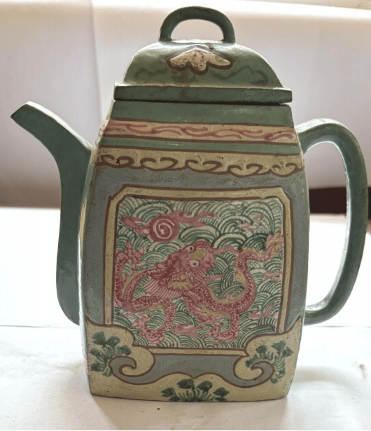 此壶以绿色系为主色调,搭配红、黄等色彩。壶身的绿色温润古朴,展现出紫砂泥料特有的质感,经过烧制和使用,会愈发温润亮泽,形成 自然的包浆。绘制龙纹所用的红色鲜艳夺目,与绿色的壶身形成鲜明对比,增强了图案的视觉冲击力;书法部分则以黑色等墨色呈现,庄重典雅。从质地来看,紫砂泥特有的双气孔结构,使得壶体透气性良好,用其泡茶,能够使茶叶的香气更好地散发和保持,且壶身具有一定的吸附性,长期使用能改善茶汤的口感。
