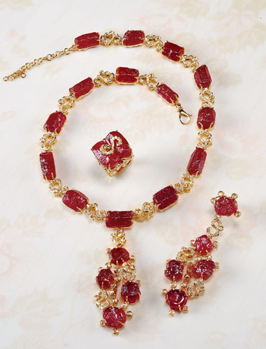 每件新作总会让人眼睛一亮的顶康珠宝,灵活运用各种宝石的特性,把闪亮、浓郁的宝石当作油彩般自由的挥洒,不论是多层次、大面积镶嵌,或是单颗的大宝石,搭配碎钻或其它宝石,都能营造出高贵华丽的不凡气势。一套以红宝原矿打磨、设计而成的套炼,呈现了红宝石的鲜艳,而保留大自然的淳朴气息,是顶康珠宝近期的得意之作。