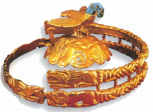 1972年内蒙古杭锦旗阿鲁柴登匈奴墓出土。鹰顶金冠有“草原瑰宝”之誉,是迄今所发现的唯一的匈奴酋长金冠饰,代表了战国时期我国北方民族贵金属工艺的最高水平。此金冠通高7.3厘米、带长30厘米、重1394克。由鹰形冠饰、半球形冠顶和冠带组合而成,其上浮雕多处动物纹饰。现藏于内蒙古博物馆。