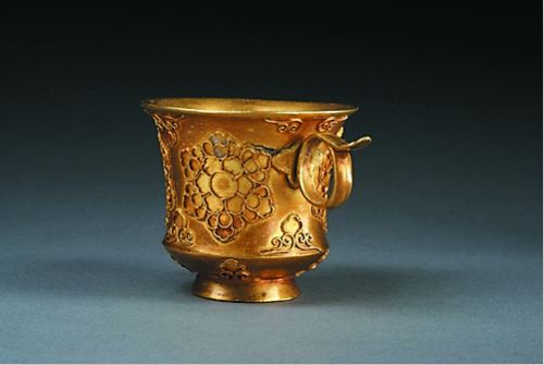 唐代的金银器呈现出了浓郁的异域色彩与前所未有的多样性。当时因东西方贸易往来频繁,唐人大量吸收了粟特、波斯萨珊等西亚和中亚金银器发达地区的工艺、造型和纹饰,经过唐代工匠不断的改进和调整最终形成自己的风格,这件器物的原型来自中亚粟特带把杯,但有两个创新细节,一是把上的指垫做成叶芽形状,环把的下面省略了指鋬。这一不同改变了粟特器物固有的风格,却在中国汉晋器物上能够找到渊源。二是把唐朝人喜爱的掐丝、焊缀和镶嵌工艺运用到器物的制作上。这种局部改造没有涉及使用功能上的变化,只是在审美上符合了唐人的愿望。(许志勇)