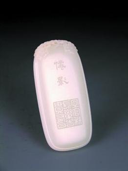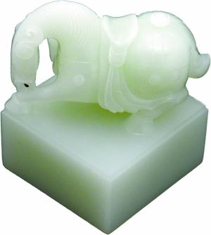 羊脂级的和田籽玉变成了一方印章,印章上一匹白色的神马俯首长啸,有刨蹄欲驰,志在千里之神韵……作品一反印章刻龙狮之传统,用一匹神马作章纽,具有强烈的视觉冲击力和鲜明的时代特征。作品构思奇特,创意新颖,造型精巧,做工精细。