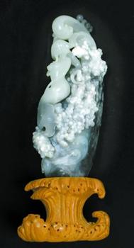 一块不太被人看好的带浆的青化籽玉,经大师的精心设计,将腐朽化为了神奇:黑色玉石上的石浆变为婀娜多姿的珊瑚礁,浅色的青化玉石刻成了美人鱼灵巧的鱼尾。洁白而带有青色水珠的浪花下面,美人鱼艳美绝伦……这种运用四种不同色彩、进行巧色雕刻的技法叫“巧雕”。《美人鱼》的巧雕体现了吴大师非凡的艺术想象和创作功力。