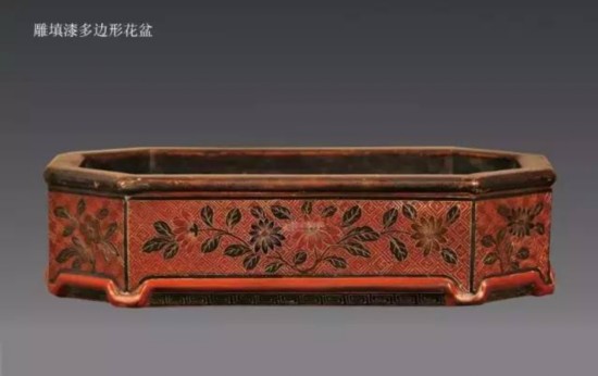 在漆器表面阴刻出花纹后,用不同的色漆填入花纹,干后将表面磨光滑。