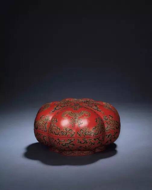 清乾隆 雕填彩漆戗金蝙蝠勾莲纹柿形盒