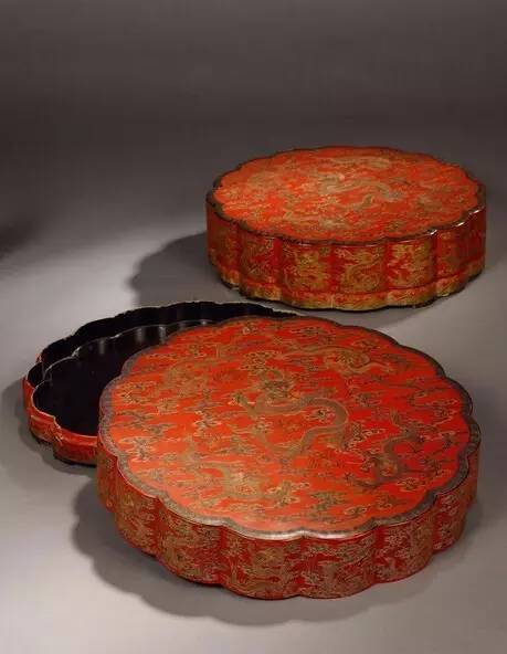 明嘉靖 戗金填彩漆龙凤纹元宝形盒