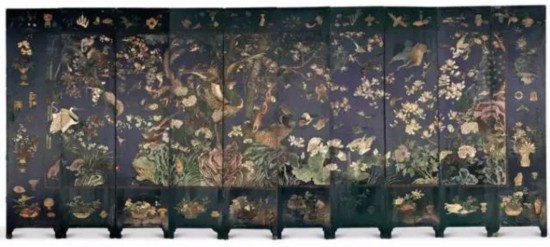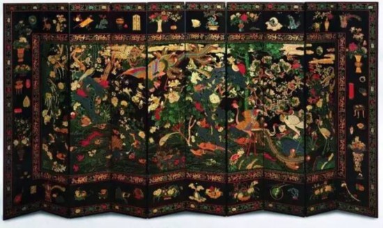 清康熙 西湖通景花鸟博古纹黑漆款彩屏凤