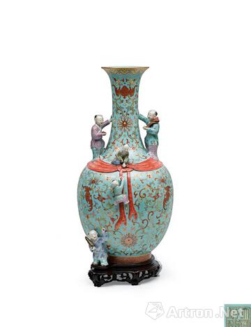清乾隆松绿地粉彩缠枝莲纹浮雕五子登科包袱瓶高42cm