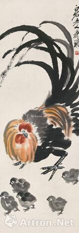 除了以孩童寓意五子外,现代艺术家也常常以公鸡为题材作“五子登科”图,在传统文化中,公鸡被称为德禽,有“文、武、勇、仁、信”五德。齐白石和李苦禅所创作的《五子登科图》,皆以公鸡护雏场景入画,绘五只雏鸡,化用窦燕山一门五子均登科及第的典故,寓意吉祥。