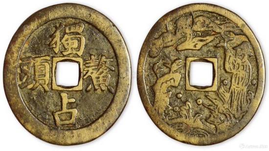吉语钱中的“独占鳌头”,如果在正面,多以字体形式出现,背面则刻绘一身着官袍、脚踏神鳌、手指红日的“指日高升图”;如果在反面,多以纹样的形式出现。