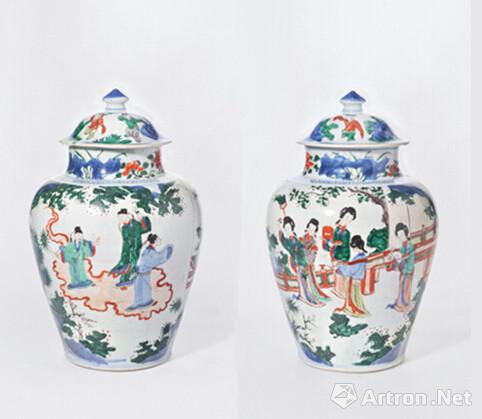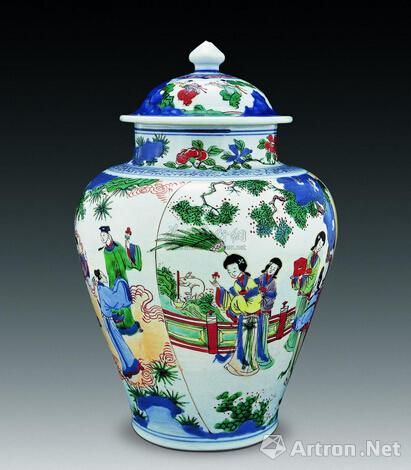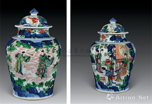 清顺治青花五彩蟾宫折桂人物盖罐腹径25cm 高36cm