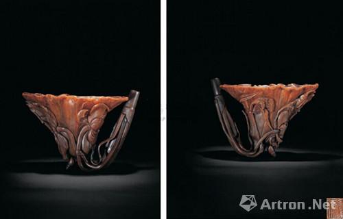 明晚期尤侃款犀角雕“科甲连绵”吸杯长16.4cm;高8cm