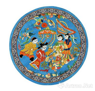 清蓝缎彩绣状元及弟凳垫38.5cm