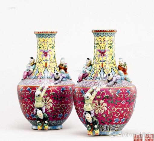 清粉彩轧道堆塑五子登科洗口瓶(一对) 高29.3cm×2