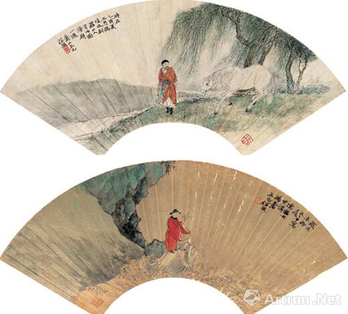 任预乙酉(1885年)作、辛卯(1891年) 柳荫牧马独占鳌头(两帧) 扇面设色纸本