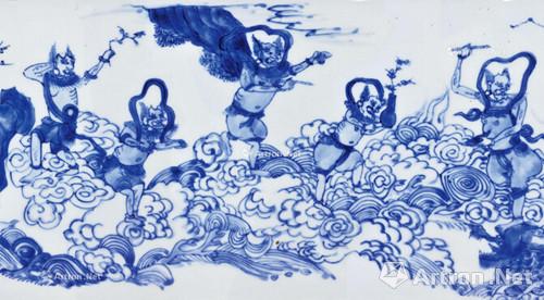 因“魁”字拆开后是“鬼”和“斗”二字,所以民间工匠在雕造或绘画魁星像时,刻意将其塑造成面目狰狞的模样。它单足立于鳌头之上,另一脚翘起,一手执笔,一手捧斗,寓意魁星点斗、独占鳌头。“清康熙青花魁星点斗图笔筒”中,画面以流云区分为两部分,第一部分一魁星左手托砚,右手执笔,一脚翘起,一脚站立于鳌头之上,寓意“独占鳌头”,另有数魁星或手持花枝,或捧宝瓶生花,寓意“一枝独秀”、“平步青云”。另一部分绘一书生端坐于案前,一书童立于其旁,另一书童牵马,前有一官员模样者似正在宣诏,整个画面似为书生高中状元之意。