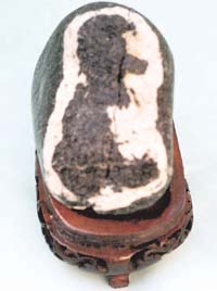 笔者石友黄勇处,见其收藏的一块命名为《达摩面壁石》的奇石(见图)。其上面的一达摩坐像与笔者早年所看到的达摩面壁石中的影像十分相似。今拍彩照一张,借《收藏金页》版一角刊登出来,以飨读者。