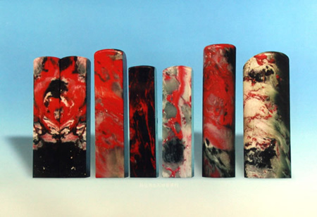 目前市场上除了低档鸡血石之外,同样有大量人造鸡血石,这些假货同样是用树脂、塑料、石粉加工而成,其色调单一,质地均匀,无裂无杂质,特别是血色呆板不自然,或红色颜料或充填辰砂,总有浮在表面的感觉。有人为了追求天然鸡血石密度较大的特征,居然在人造鸡血石里加埋铅条,可见他们还缺乏必要的真诚。 |