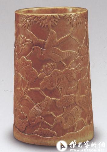 象牙笔筒:在形形色色的笔筒中,牙雕笔筒雍容华贵,玲珑剔透,可谓其中高雅、名贵的种类,因而备受藏家珍爱,成为古玩中颇具特色的收藏品之一。象牙是大象身上最坚固的部分,属于有机质,表面滑润细腻,具有硬度适中耐用、光泽柔和光滑、牙纹光洁如玉等特点,容易受刀,是制作高档工艺品的天然材质。牙雕作为一门古老的传统艺术,在我国历史悠久,最早可追溯到远古的新石器时代,辽、金、元、明、清历代都把象牙作为皇家贡品,明代的果园厂和清代的造办处都有为皇宫做象牙制品的专门作坊。象牙雕刻经过漫长岁月的演绎,至明清两代达到鼎盛时期,逐渐出现在装饰用品上,并成为牙雕工艺的主流。牙雕技法完备,手法多样,主要有圆雕、浅浮雕、高浮雕、镂雕、透雕等,分为人物、动物、花卉和风景等四个种类,地域上主要有广州牙雕、苏州牙雕、背景牙雕等。