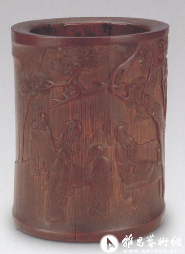 竹笔筒:竹是中国有着特殊文化意蕴的植物,与“梅、兰、菊”一起被称为“四君子”,和“松、梅”一起则被称为“岁寒三友”,其象征的高雅品格和坚贞精神,历来为国人所尊崇。竹雕也称竹刻,是以竹为材质雕刻而成的工艺品,清末古玩收藏家赵汝珍在《古玩指南·竹刻》中写道:“竹刻者,刻竹也。其作品与书画同,不过以刀代笔,以竹为纸耳。”明代中叶以后,在竹雕文化极其发达的江南地区,逐渐形成了金陵(今南京市)和嘉定(今属上海)两个竹雕艺术中心,清代乾嘉文人金元钰所著《竹人录》记载:“雕琢有二派,一始于金陵濮仲谦,一始于嘉定朱松邻。”中国文人士大夫大多钟爱竹子,北宋苏东坡诗云:“无肉让人瘦,无竹让人俗,宁可食无肉,不可居无竹。”文房之中,用竹子加工成的臂搁、镇纸、墨床、水盂、砚屏、笔觇、笔山等比比皆是,文人尤其崇尚使用竹雕笔筒。明代晚期的著名文人屠隆就对竹木笔筒情有独钟,在《文房器具笺》之笔筒条中写道:“湘竹为之,以紫檀、乌木棱口镶坐为雅,余不入品。”清代扬州竹雕大家潘西凤也曾在笔筒上以隶书刻款曰:“虚其心,坚其节,供我文房,与共朝夕。”由此可见竹雕笔筒蕴含的深厚的文化内涵和独特魅力。