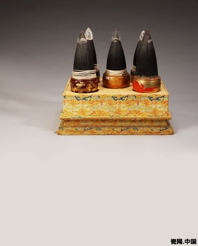 清代内廷用笔由江南织造、江宁织造、杭州织造等按内廷发样承办制作,而大量的则是来自地方进贡,每年地方官员单以毛笔进贡的数额即高达数万件。除大量的御用笔备用外,还颁发内廷各处记录、抄书使用,以及用于皇帝赏赐等。据章乃炜《清宫述闻》记载:“庚申十月,赐内阁翰林院官笔五千枝,为阁中票签、院中讲章、记注之用。内阁分其半,余给讲官人各五十枝,写正本者人各五十枝,写副本者人各三十枝。更以五百枝备写档案,存起居注。五百枝备写讲章,存外衙门。笔为丁酉年制,世祖御书房所藏也。”(庚申为康熙十九年,即1680年,丁酉为顺治十四年,即1657年)从上述记载可知,清代内廷所需用笔的数量相当可观。