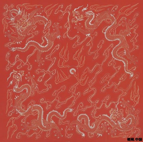 图15、朱红描金龙戏珠纹斗方绢