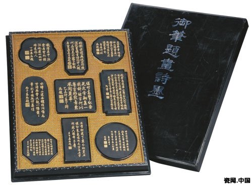 清代徽州以歙县、休宁、婺源三地制墨最负盛名,并由此形成三大制墨派系。其中汪希古、曹素功、汪近圣、汪节庵、胡开文、詹方寰等世代以制墨为业,均有贡墨制作。如歙派最具代表的墨家是康熙年间曹素功“紫玉光”墨,被列为第一贡品。现今故宫博物院藏有康熙时期曹素功谨制“御制耕织图诗文”墨和汪希古恭摹“御制耕织图诗文”墨,均以康熙御制诗文为蓝本,分别摹勒于墨品,为47锭集锦墨形式。此后各朝均以御制耕织图诗墨进贡内廷,成为重要的贡墨形式。如汪近圣后代沿袭制墨,将汪氏墨品集成《鉴古斋墨薮》。其中所录乾隆朝贡墨,大部分是以乾隆御制诗文为蓝本创作墨式,墨模雕刻精细,诗书、画印均可摹勒于墨。至今北京故宫博物院藏有汪氏墨品数百件,对了解汪氏制墨种类、形制特点等具有重要的史料价值。
