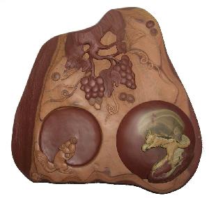 ④雕刻:砚石雕刻一般要求掩疵显美,不留刀痕。传统的砚刻技法一般采用深、浅浮雕(高、低浮雕)、细刻、线刻为主,必要时加以圆雕、镂空配合,使外观圆润、细腻、干净。有的优质高档砚材只要稍加雕琢甚至不加雕刻,稍事磨光便可成一块非常珍贵的砚──平板砚。