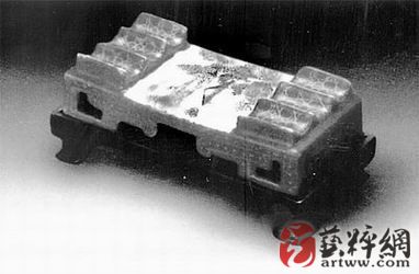 笔觇到了清代,发生了材质与造型上的变化。材质由陶瓷、玉石类,改变成更具有应用功能的砚石,尤其追求石中名品,如端石中的鱼脑冻、蕉叶白、天青,歙石中的罗纹、眉子、金星等。所以它们的观赏性和收藏价值常常要胜过实用价值。笔觇的造型也发生了变化,由原先的花色浅碟状,演变成不事雕琢,打磨细腻的砚式素面状。它又可分为两大类,其一为做工厚重、古朴的几何形状,以长方形居多,亦有花状与祥云形等,均为光滑素面,最多在石边略加边款刻字,故又有“砚砖”之名。其二,取天然仔料磨平而为之,留有天然的皮色,纯朴而古雅,又可称“仔砚”。至此,笔觇名称也变成“笔掭”了。