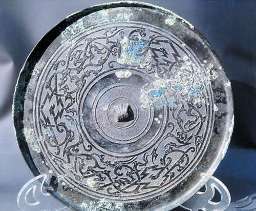 此镜以镜钮为中心,按九个区域向外扩大辐射,第三区为绳纹,其余为旋纹。喻“九九归一”之含意。不仅雕工一流,而且版模首屈一指,可见当时工匠们的高超技艺和雕刻水平是多么娴熟与精妙,让今人叹为观止。镜面大气磅礴,龙飞凤舞,神态一目了然,给人以极其开阔的想像空间。似三条巨龙与三只美丽的凤在天空中飞翔和追逐,又像在天空中载歌载舞。让人们联想到当时先人们安居乐业,一派盛世景象。(李训刚)