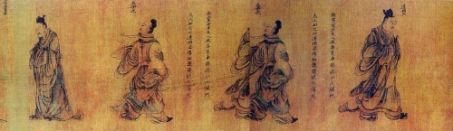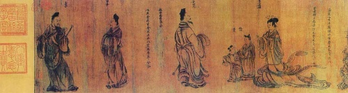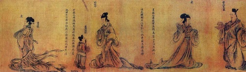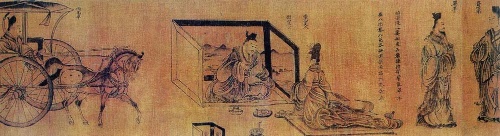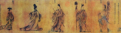 《列女仁智图》卷旧传东晋顾恺之作,此为南宋人摹本。(局部) 绢本,墨笔淡着色,纵25.8cm,横417.8cm。 仁智卷共收集15个列女故事。此卷为残本,其中“楚武邓曼”、“许穆夫人”、“曹僖氏妻”、“孙叔敖母”、“晋伯宗妻”、“灵公夫人”、“晋羊叔姬”7个故事保存完整。“齐灵仲子”、“晋范氏母”、“鲁漆室女”3个故事只存一半,其余5个故事则全丢失,又错将“鲁漆室女”之右半与“晋范氏母”之左半拼接在一起,使人误以为是一个故事。 根据《列女仁智图》中保存有较多的汉代风俗,以及其构图形式的古朴,推测此卷的原本应当出自于东汉时代,而祖本则为刘向所创。剔除后世在反复传摹中所附加的痕迹,仍然能透视二千年前汉代宫廷绘画的艺术光辉。其人物线条粗犷流畅,造型准确。特别是对妇女的描绘,体态轻盈,婀娜多姿,尤为绝妙。构图布局则与汉画像石一脉相承。《列女传》及《列女仁智图》在宋代有多本,此是被保留下来的惟一的一本,尤为珍贵。