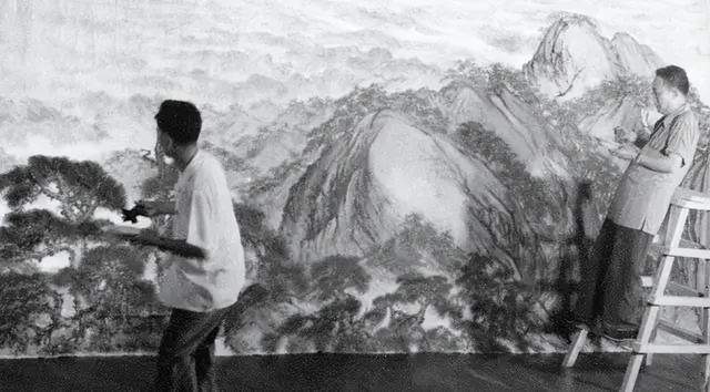 于是他中断了写生,匆匆赶到南京家里,才知道周恩来总理和陈毅等人点将,要他为人民大会堂创作一幅巨制迎接建国10周年,合作者是岭南派的关山月。而画幅之大在中国绘画史上也不多见,宽9米、高5.5米。
